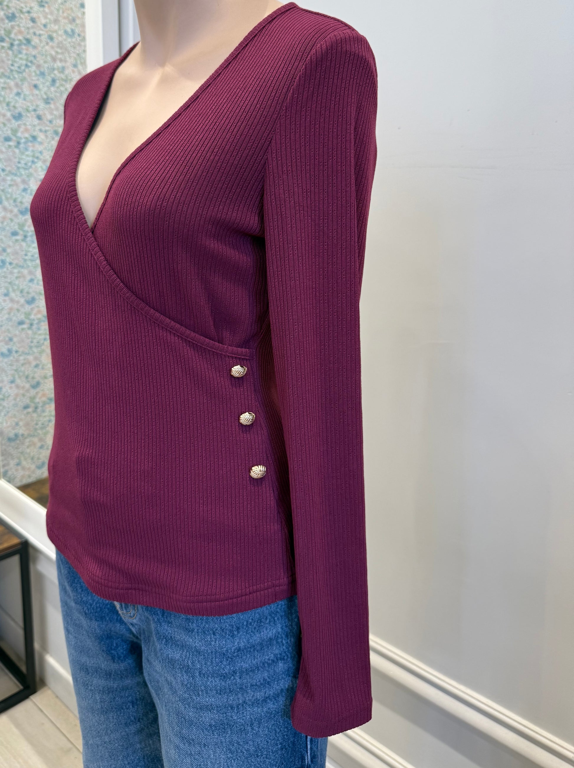 Top cache-cœur en maille légère côtelée à boutons dorés