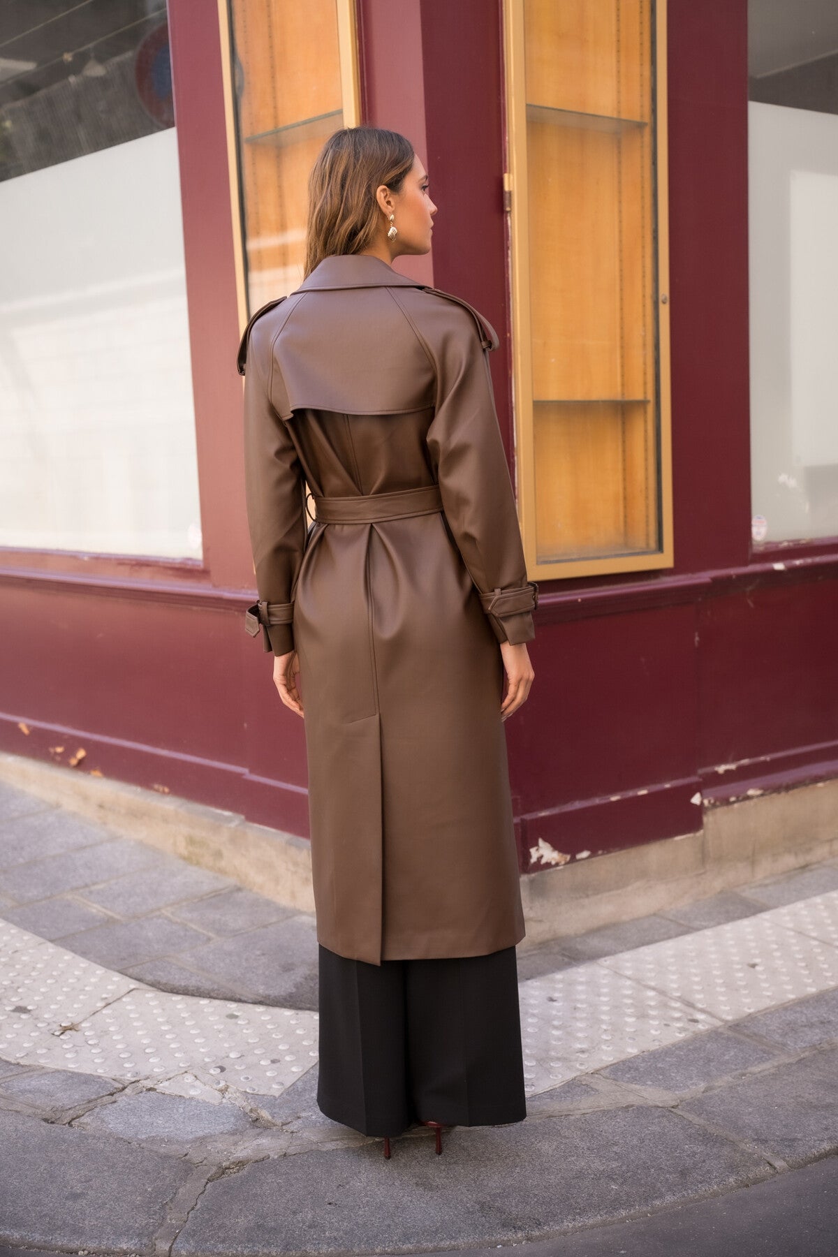 Veste style trench long en cuir vegan. Col tailleur structuré. Double boutonnage sur le devant. Ceinture ton sur ton à boucle rectangulaire. Pattes boutonnées aux poignets. Épaulettes discrètes. Coupe droite et fluide.